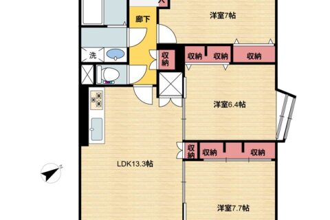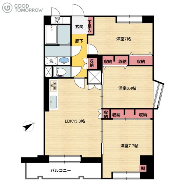開放感ある角住戸: 全居室収納付きで、お部屋を広々と使えるのが魅力です。